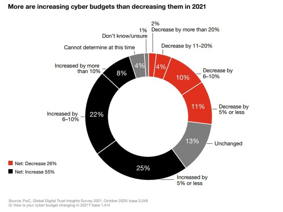 Il 55% dei dirigenti aziendali prevede di aumentare i budget per la sicurezza informatica nel 2021 e il 51% aggiungerà personale informatico a tempo pieno.