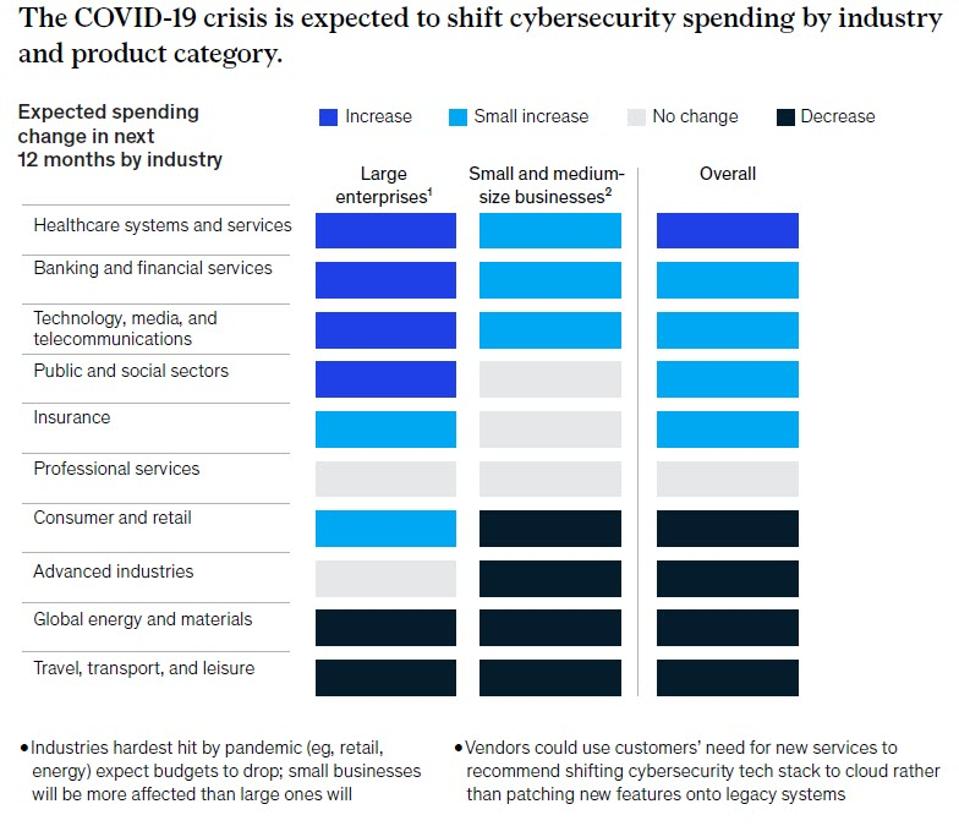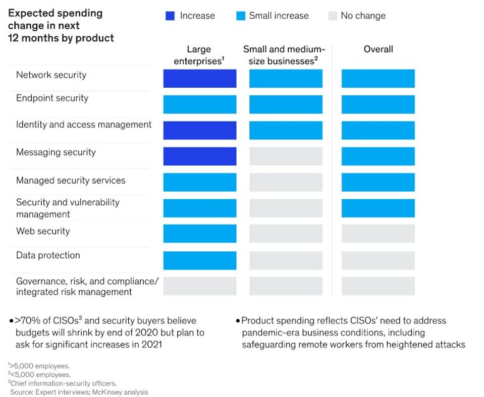 Nei prossimi 12 mesi, la spesa per la sicurezza informatica crescerà più rapidamente nelle grandi imprese che competono in questi quattro settori chiave. McKinsey prevede che la spesa per la sicurezza informatica riprenderà più rapidamente nelle enterprise rispetto alle piccole e medie imprese (PMI). Inoltre, ci si aspetta di vedere aumenti del budget per segmenti specifici per i settori dei servizi finanziari e assicurativi, inclusi i controlli di sicurezza per le funzioni aziendali basate su cloud.