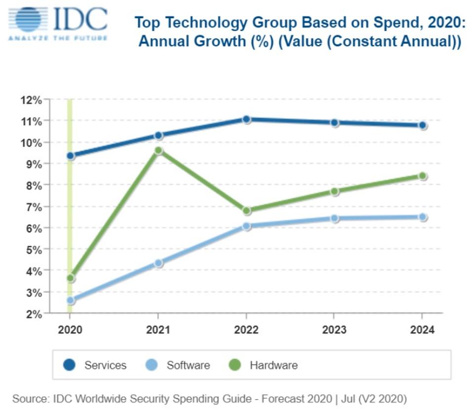 IDC prevede che i servizi di sicurezza saranno il segmento più ampio e in più rapida crescita del mercato, rappresentando circa la metà di tutte le spese durante il periodo di previsione 2020-2024, raggiungendo un CAGR quinquennale del 10,5%.