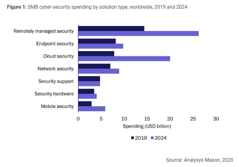 Analysys Mason prevede che la spesa delle piccole e medie imprese (PMI) per la sicurezza informatica (inclusi hardware, software e servizi) in tutto il mondo crescerà a un CAGR del 10% tra il 2021 e il 2024, diventando un mercato da 80 miliardi di dollari in quattro anni.